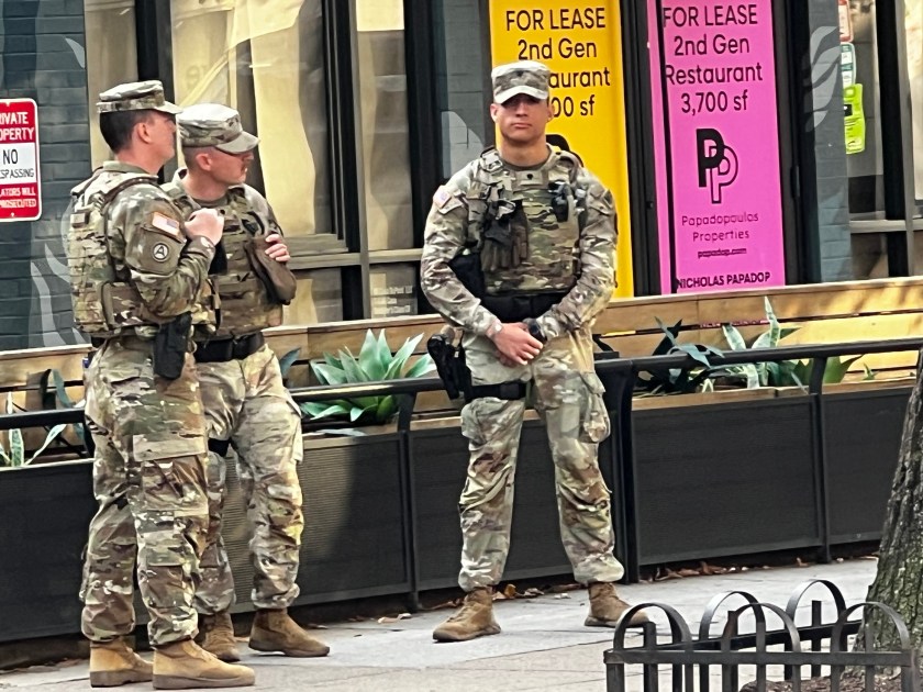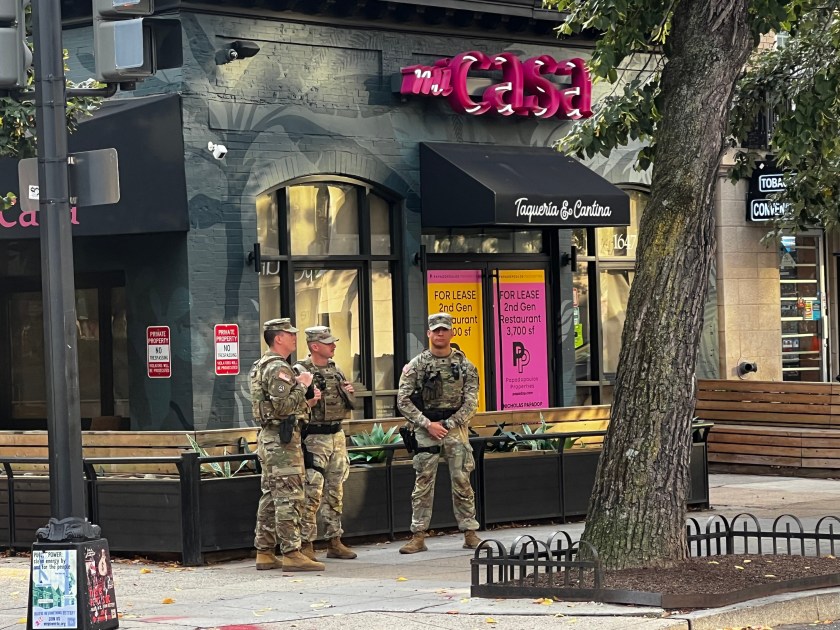 National Guard troops armed with pistols are seen at the intersection of R Street, 20th Street and Connecticut Avenue Northwest in Washington, D.C., on the morning of Friday, Sept. 5, 2025. Video by Gilbert DunkleyNational Guard troops armed with pistols are seen at the intersection of R Street, 20th Street and Connecticut Avenue Northwest in Washington, D.C., on the morning of Friday, Sept. 5, 2025. Photo by Gilbert DunkleyNational Guard troops armed with pistols are seen at the intersection of R Street, 20th Street and Connecticut Avenue Northwest in Washington, D.C., on the morning of Friday, Sept. 5, 2025. Photo by Gilbert DunkleyPeople without homes and people with homes start their day near Q Street and Connecticut Avenue NW in the north Dupont Circle neighborhood of Washington, D.C., on Friday, Sept. 5, 2025. At the moment that this picture is taken, three armed National Guard troops are standing one block north at R Street and Connecticut Avenue NW. They are obscured by that tree at left in the background. This area already is highly policed, because it is home to embassies and ambassadorial residencies, and because many of Washington’s power players in politics and business have homes nearby. Even Jeff Bezos’s D.C. home (the city’s largest residential square footage) is in the neighborhood. Photo by Gilbert Dunkley