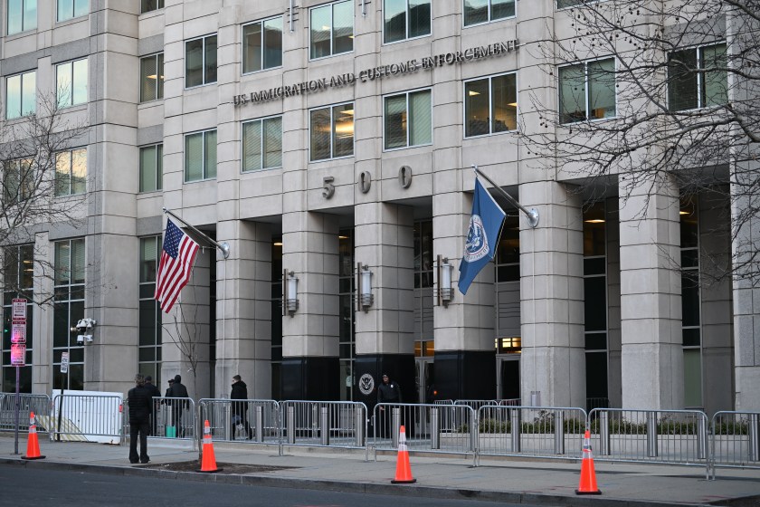 Crowd control barriers line the front of the headquarters of U.S. Immigration and Customs Enforcement at 500 12th Street SW in Washington, D.C., on Thursday, Jan. 8, 2026. Protesters had gathered outside ICE headquarters the previous night to protest Wednesday’s fatal shooting in Minneapolis of a U.S.-citizen civilian, Renee Good, by an ICE agent, Jonathan Ross.