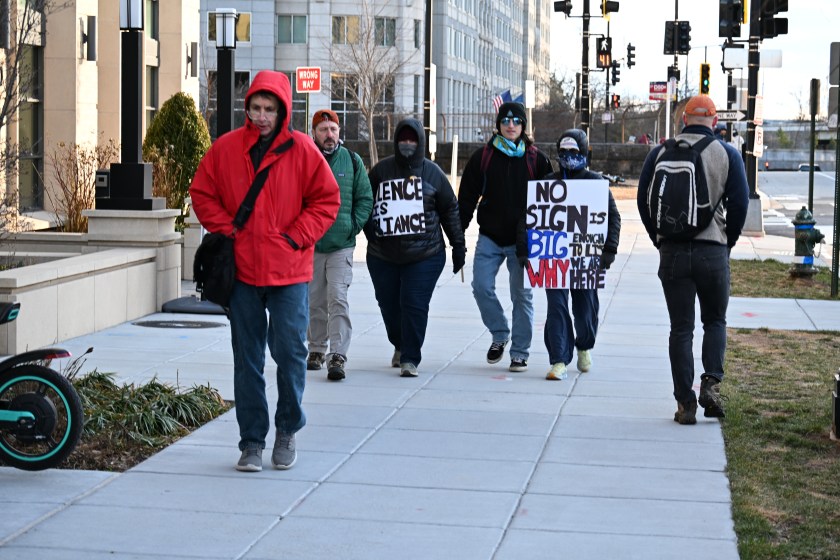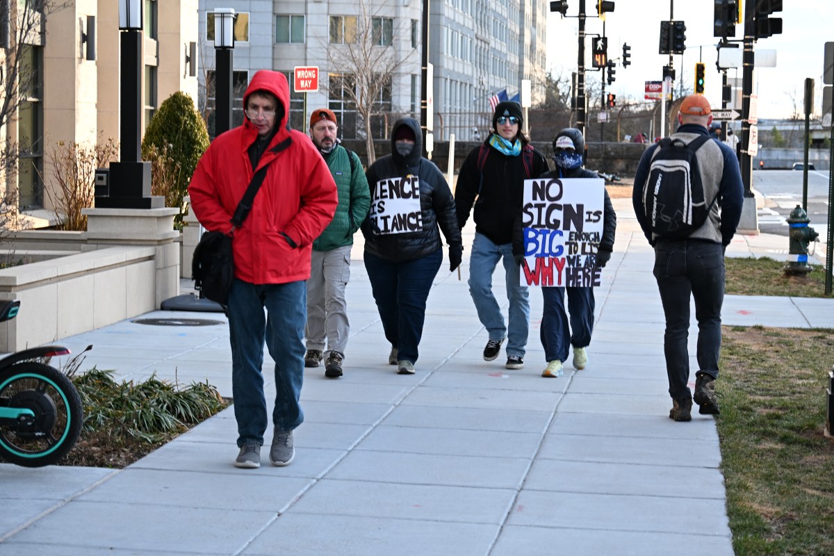 Protesters head away from the headquarters of U.S. Immigration and Customs Enforcement at the end of a n hours-long demonstration and during biting cold in Southwest Washington, D.C., on the afternoon of Sunday, Jan. 11, 2026.