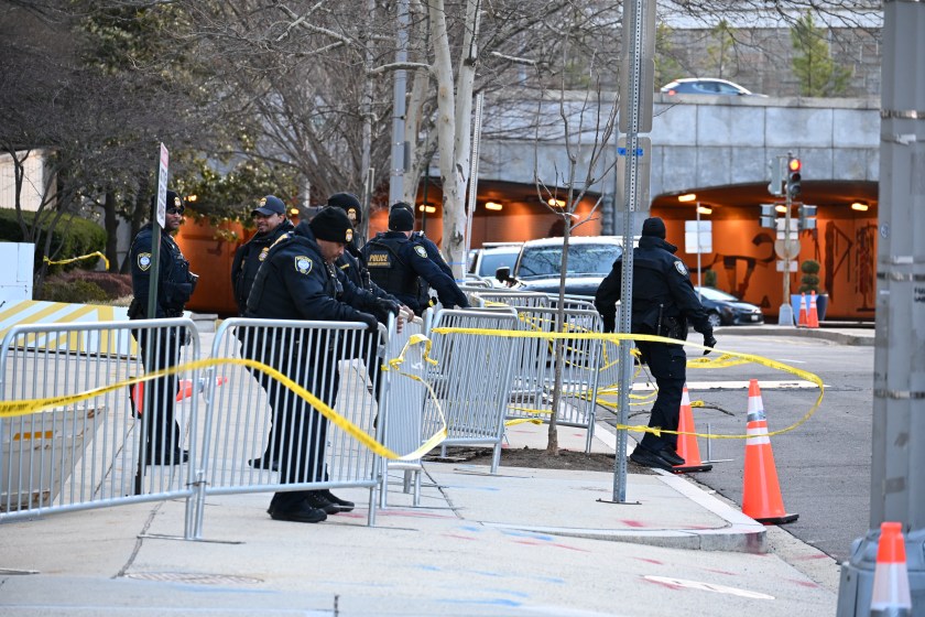 Law enforcement officers adjust crowd-control barriers outside ICE headquarters in Southwest Washington after the departure of protesters on the afternoon of Sunday, Jan. 11, 2026. A strong wind, seen here buffeting police caution tape, caused the feel-like temperature to drop so painfully low that it may have contributed to the breakup of the protest.