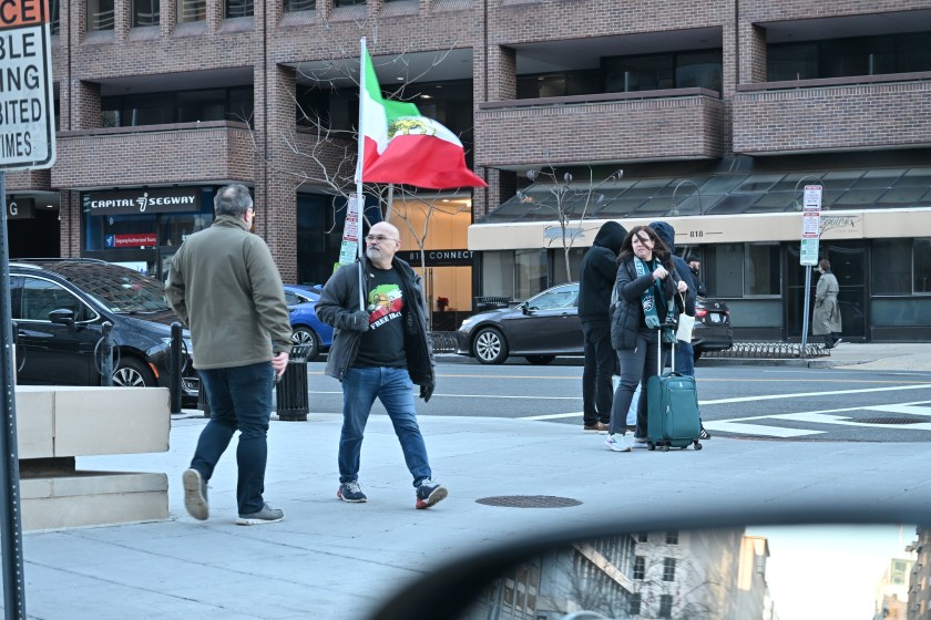 A demonstrator coming from the vicinity of the White House carries Iran’s pre-revolution national flag in Washington, D.C., on Sunday, Jan. 11, 2026. Iran has been rocked by widespread protests against economic hardships and the hardline theocratic government. President Trump has threatened to intervene militarily in the country to safeguard protesters against government violence aimed at suppressing the demonstrations.